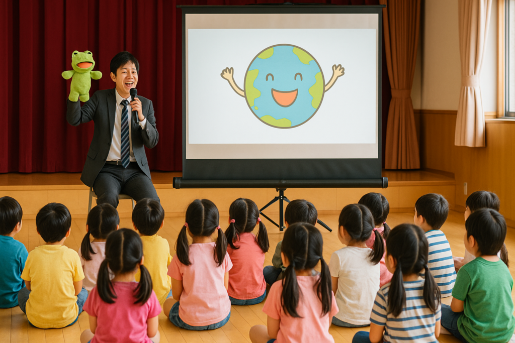 講演では、リサイクルやエネルギーといった身近なテーマを、遊びや体験を交えて伝えています。子どもが自分から考えたくなる流れをつくるため、会場全体に一体感が生まれやすくなります。保護者や教育者にとっても、家庭で取り組める環境への意識づけが得られる点が魅力です。