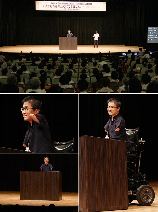 『五体不満足』出版以来、メディアでの発言やその生きる姿によって、それまでの一般的な“障害者像”をことごとくくつがえしてきた。ベストセラーになった著書『五体不満足』の中でも語るとおり、彼を育てた両親、学校の恩師、周りの友人ら、彼が育ってきた環境の中に「ほんとうのバリアフリー」のヒントはあるはず。話を聴くだけでなく、一人ひとりがそれぞれの頭で<考える>講演です。 - 生き方「チャレンジ精神を忘れずに」